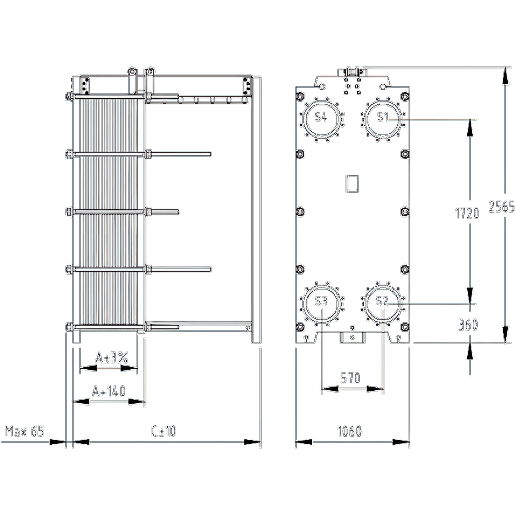 Модель Ду, мм Площадь теплопередачи Max, м2 Расход через один контур Max, м3/ч Высота, мм Ширина, мм Толщина пакета пластин А, мм Длина C min-max, мм Масса, кг