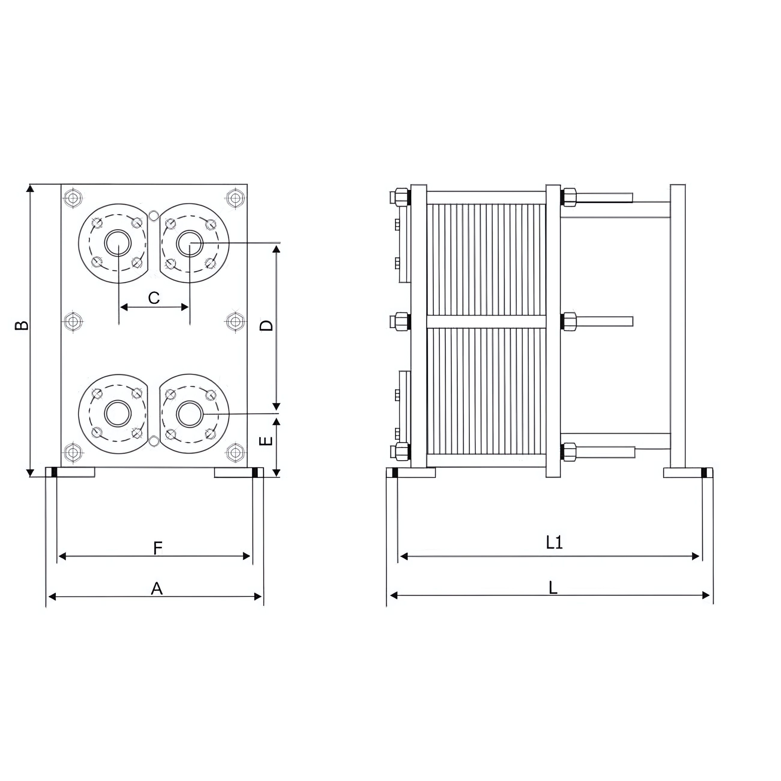 Модель Ду, мм А, мм B, мм C, мм D, мм E, мм F, мм L, мм L1, мм Кол-во пластин, шт
