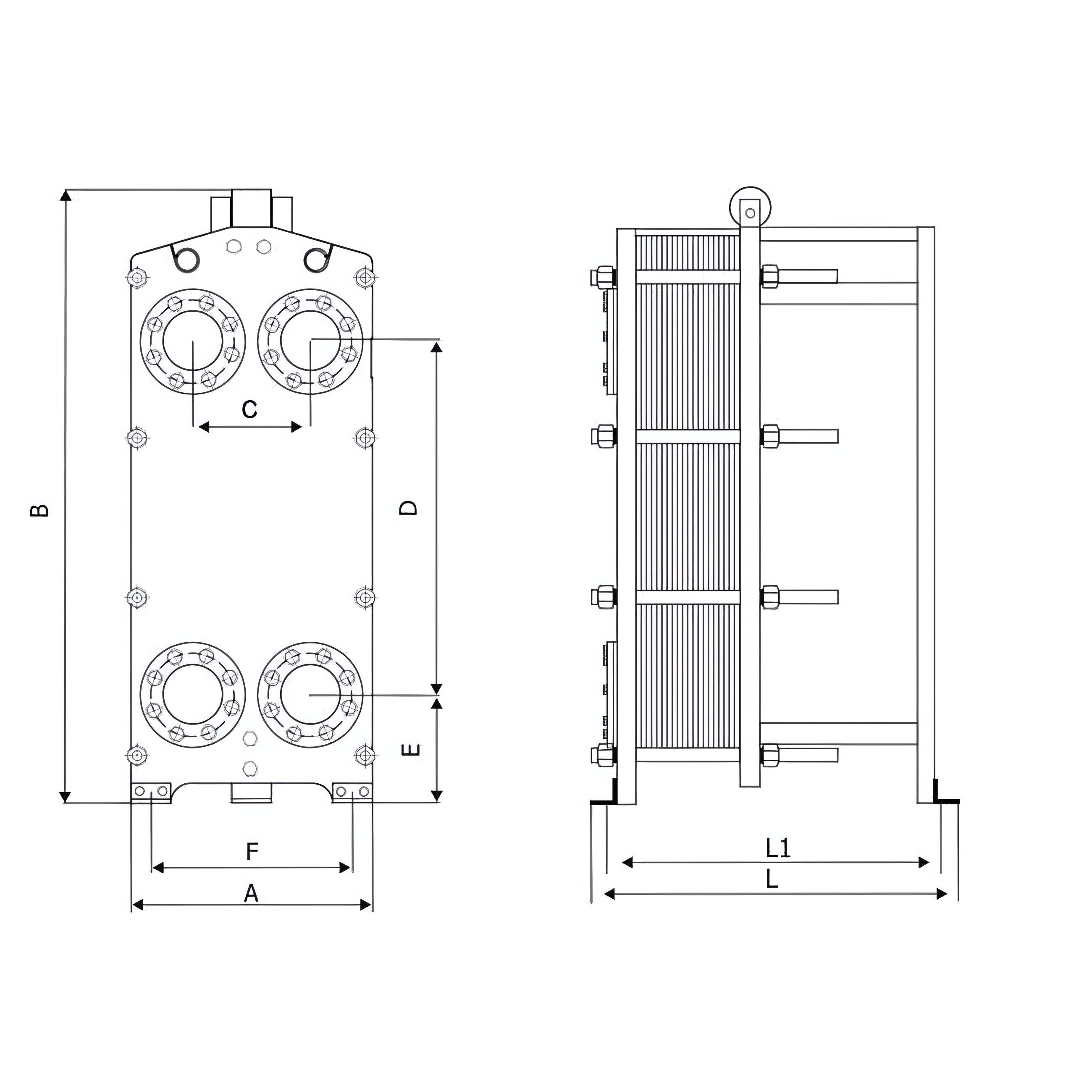Модель Ду, мм А, мм B, мм C, мм D, мм E, мм F, мм L, мм L1, мм Кол-во пластин, шт