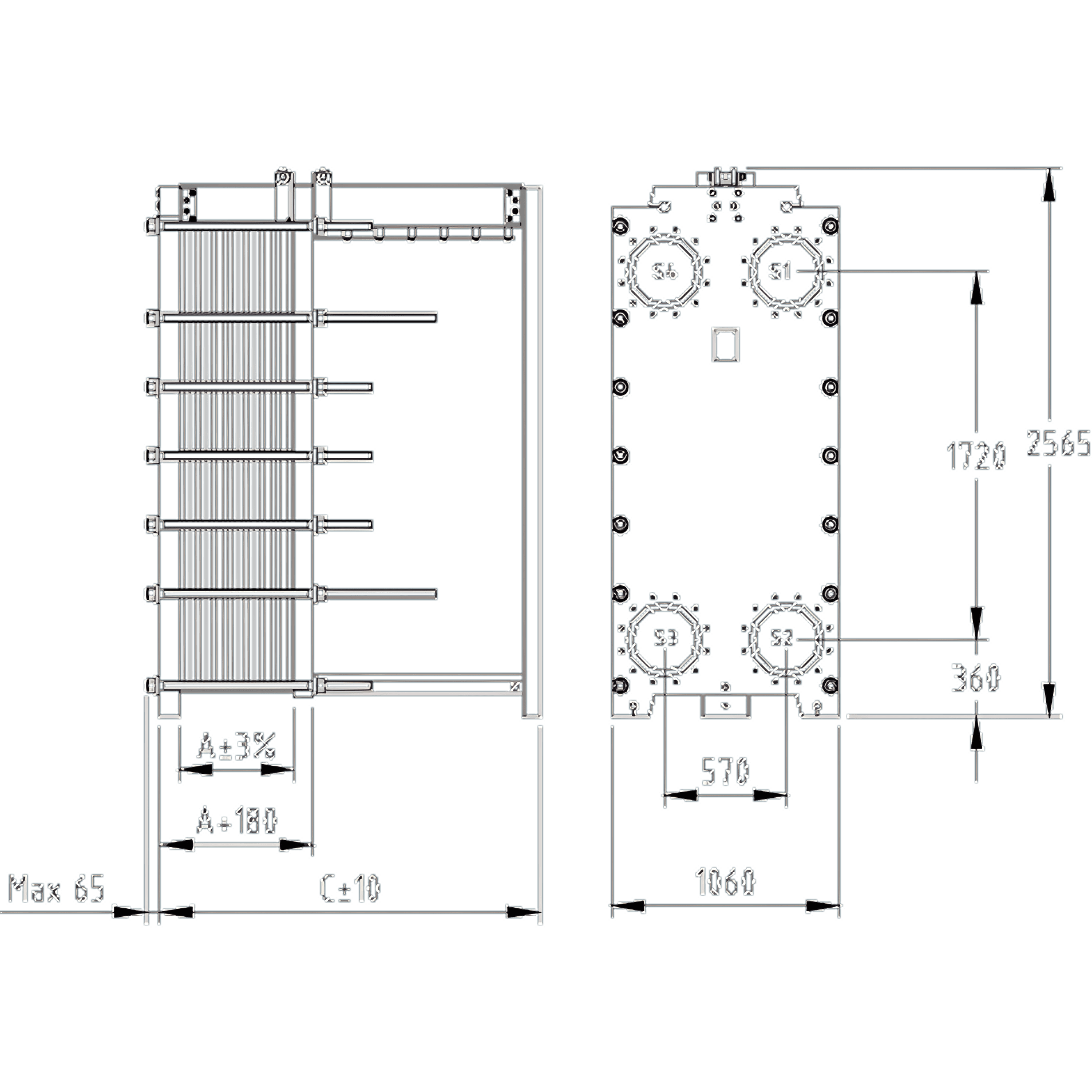 Модель Ду, мм Площадь теплопередачи Max, м2 Расход через один контур Max, м3/ч Высота, мм Ширина, мм Толщина пакета пластин А, мм Длина C min-max, мм Масса, кг