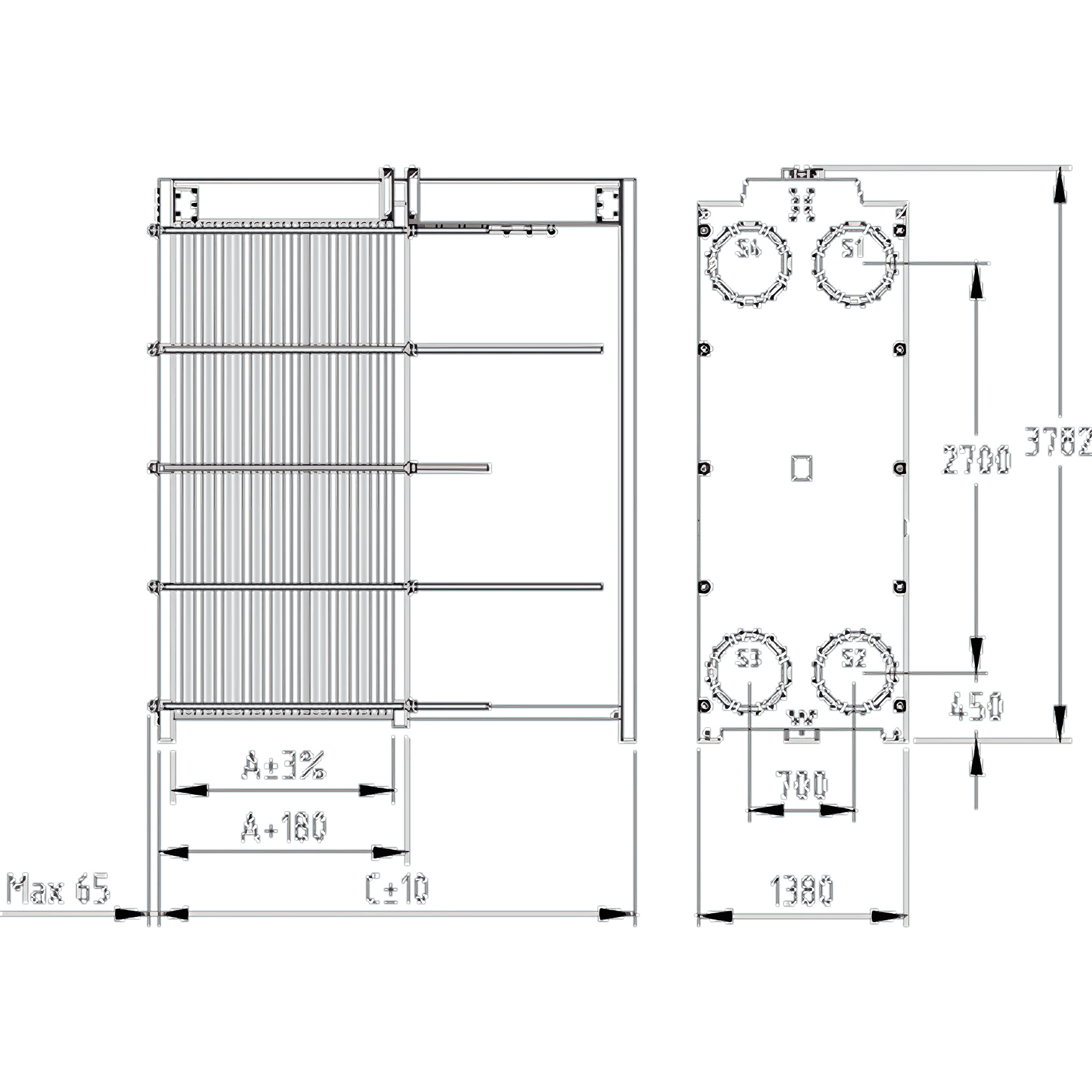 Модель Ду, мм Площадь теплопередачи Max, м2 Расход через один контур Max, м3/ч Высота, мм Ширина, мм Толщина пакета пластин А, мм Длина C min-max, мм Масса, кг