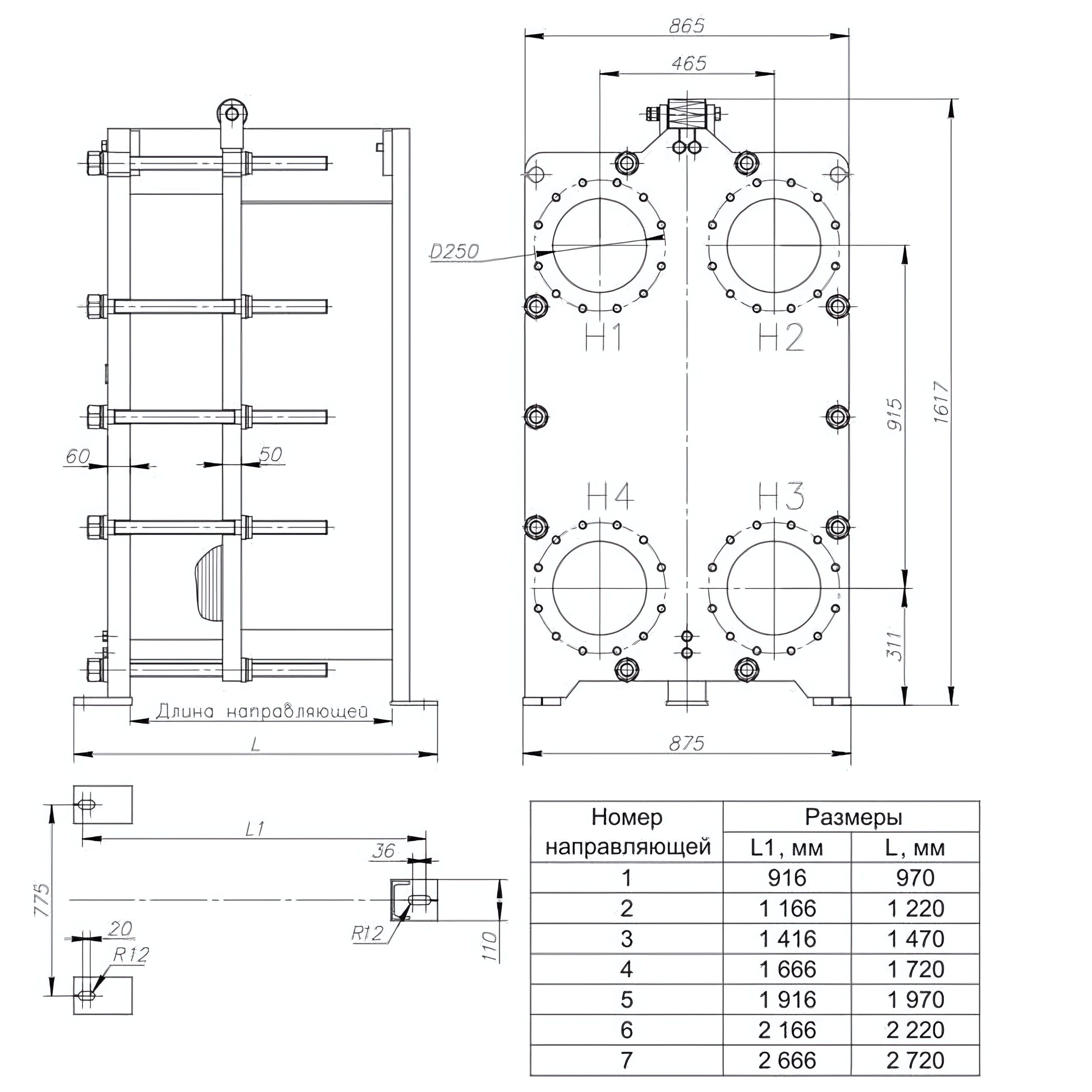 Модель Ду, мм Длина направляющей, мм Номер направляющей Площадь пластины, м2 Количество пластин в пакете Площадь теплообмена, м2 Масса, кг
