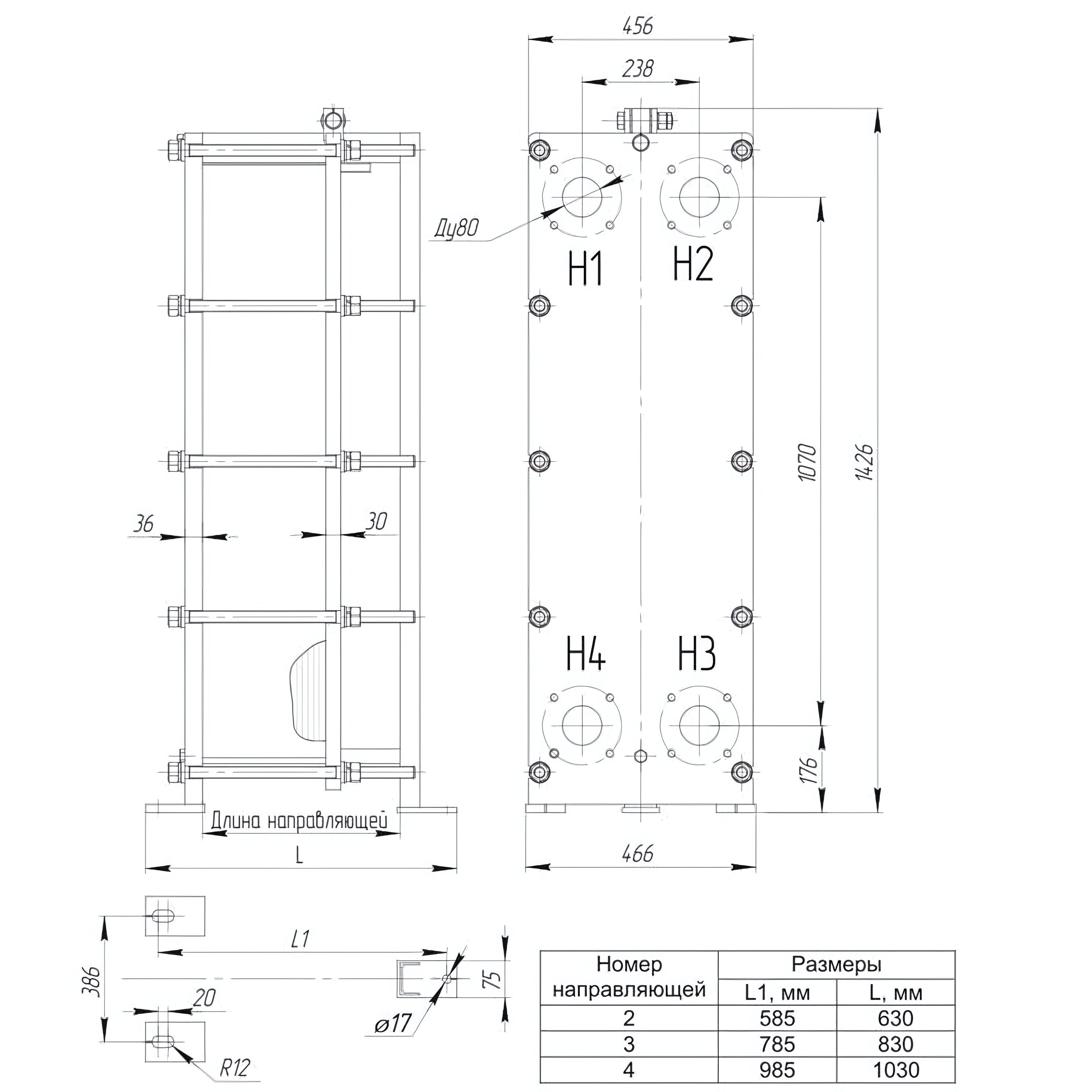 Модель Ду, мм Длина направляющей, мм Номер направляющей Площадь пластины, м2 Количество пластин в пакете Площадь теплообмена, м2 Масса, кг